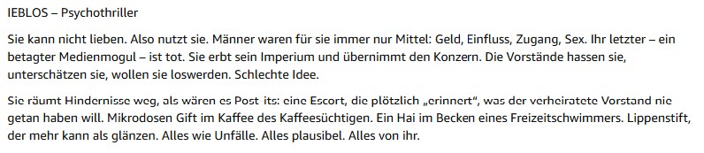 Die Handlung ist schwer nachzuerzählen, weil sie trotz vieler Worte unverständlich und fahrig bleibt. Ein Erzähltempo gibt es nicht. Das ganze Buch liest sich, als hätte jemand dauerhaft „Stufe 3“ eingestellt. Alles ist gleich und alles ist dabei gleich fade und unangenehm. Immer wieder ergeben Sätze keinerlei Sinn. Oder passen nicht in den Kontext. Und dann hat da auch noch jemand wenig „Liebe“ bei „Lieblos“ walten lassen. Bei der Beschreibung des Buches ist schon das erste Wort „Lieblos“ nicht besonders „liebevoll“ lektoriert. Und auch der Anreißer von „IEBLOS“ wirft hier schon Fragen auf: